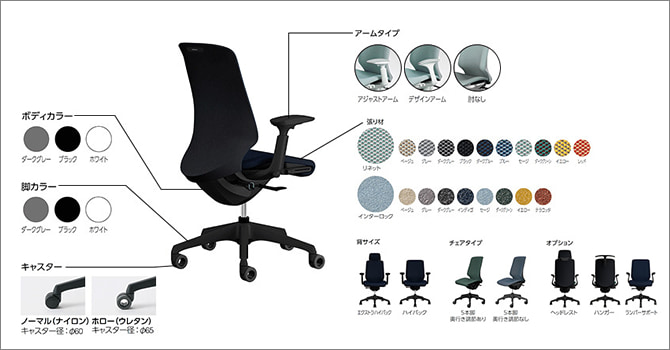 張地については、スフィアは背座張りぐるみタイプのみ、シルフィーは背メッシュタイプと背クッションタイプがございます。