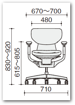 幅:670〜700mm / 奥行:580〜640mm / 高さ:830〜920mm / 座幅:470mm / 脚羽径:710mm / 座奥行:510mm(最深部) / 座高:425〜515mm / 肘高:615〜805mm