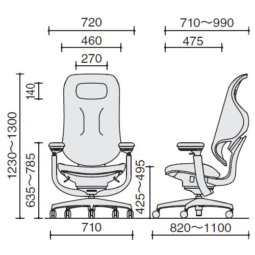 幅:720mm / 奥行:710〜990mm / 高さ:1230〜1300mm / 座幅::575mm / 座奥行:475mm / 脚羽径:710mm / 座高さ:425〜495mm / 肘高さ:635〜785mm / 肘内寸法:460mm / 自重:20.8kg